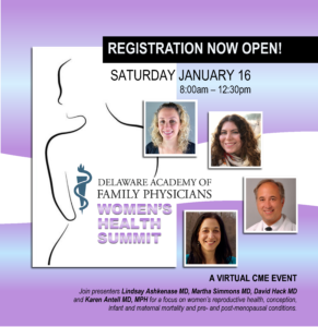 The Delaware Academy of Family Physicians is proud to present our first CME event of the new year - plan to join us on Saturday, January 16 for the Women's Health Summit, featuring Lindsay Ashkenase, MD, Martha Simmons, MD, David Hack, MD and Karen Antell, MD, MPH. Topics include maternal and infant morbidity and mortality associated with racial disparities; understanding the newest options in contraceptive care and counseling your patients using evidence-based information on making a selection; providing a framework for addressing key components of preconception care to ensure a healthy pregnancy and "a vigorous and happy newborn;" and using case-based scenarios, different approaches to discussing how menopause can impact your patient's well-being and the types of therapies available to treat these symptoms.